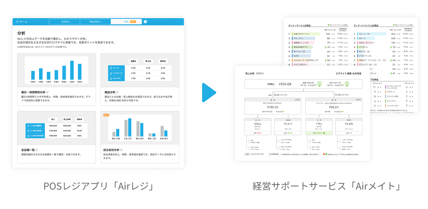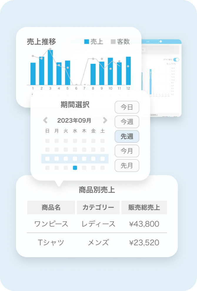 『Airレジ』で会計するだけで、売上などの数字が自動的に集計されます。売上データは、いつでもどこでも確認することができます。