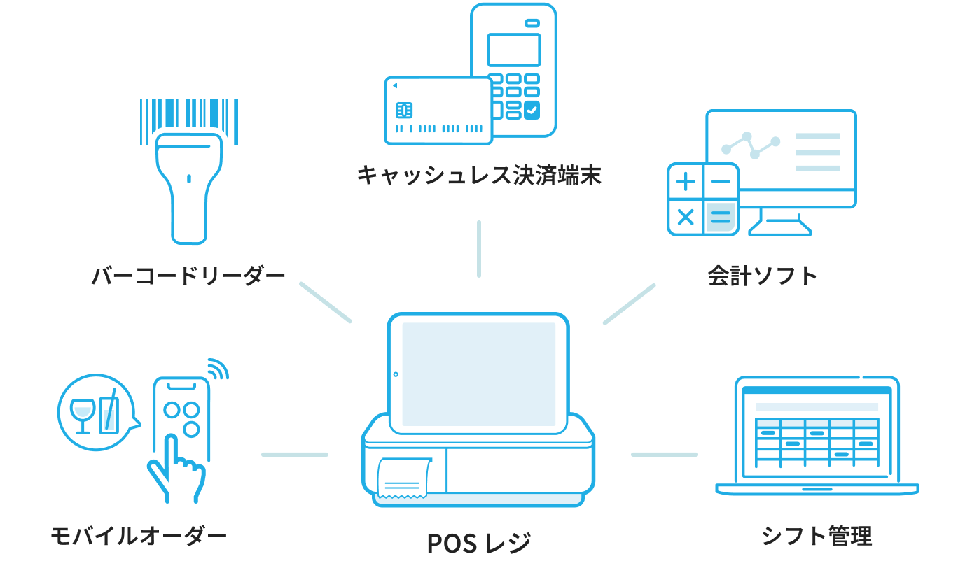 - 近年は低コストなタブレット型POSの導入が増えており、キャッシュレス決済や外部システムと連携して使うのが一般的