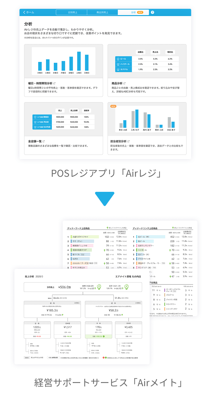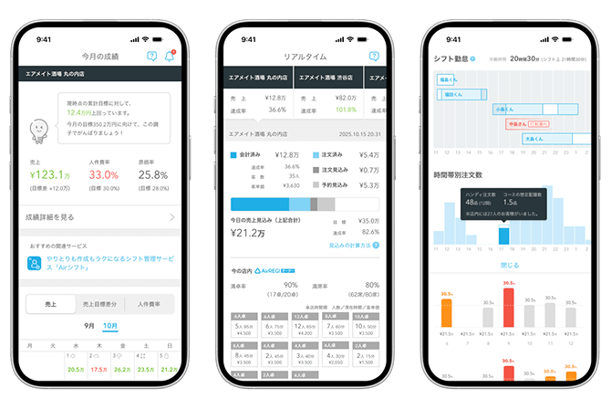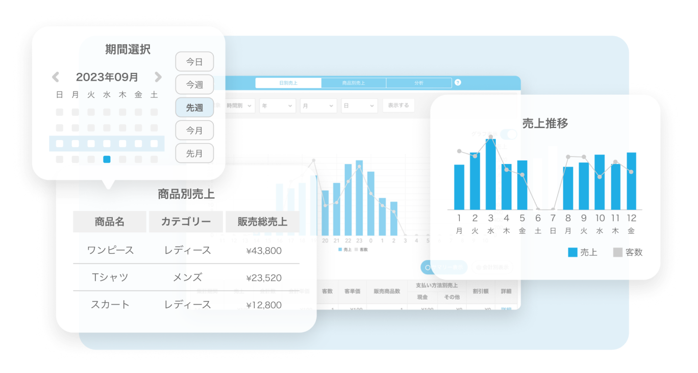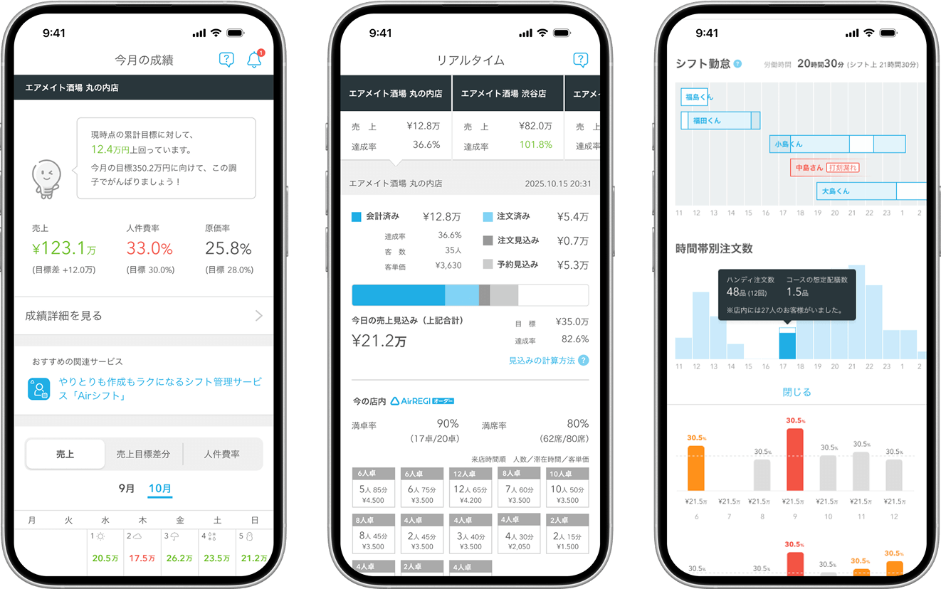 『Airレジ』で会計するだけで、売上などの数字が自動的に集計されます。売上データは、いつでもどこでも確認することができます。