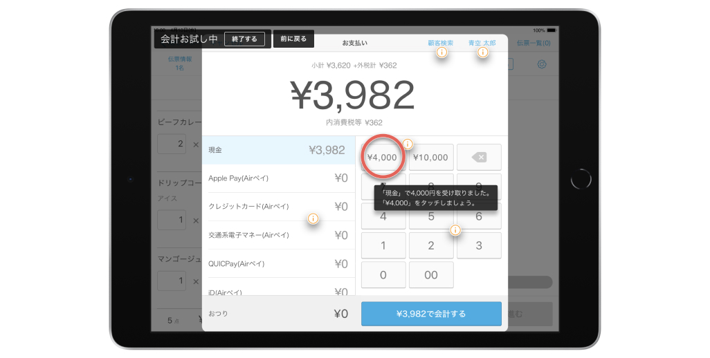 なお、『Airレジ』であれば、金額を打ち間違えてしまった場合でも、直感的に操作しやすいように配置された削除ボタンから容易に金額を訂正することができます。
