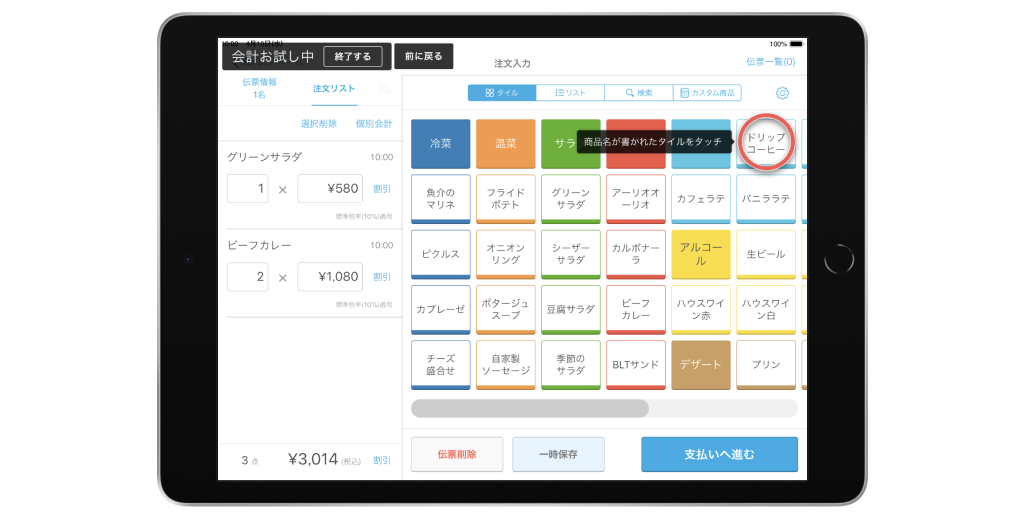 タブレット型POSレジは、事前に商品や金額が登録できる機能を搭載しています。商品や個数を選択するだけで自動的に合計金額が算出されるため、手計算が不要です。結果的にレジの打ち間違いを減らすことができます。