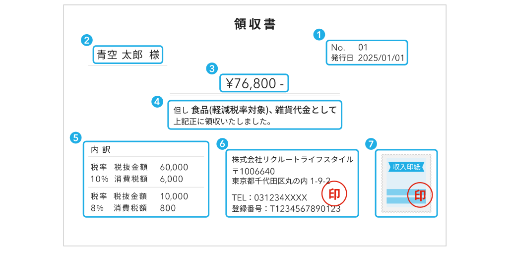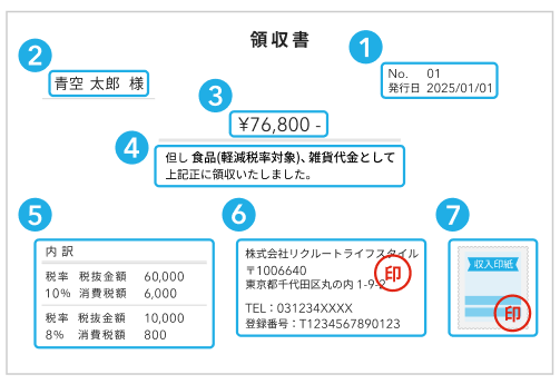 領収書には下記7つの項目を記載します。一つずつみていきましょう。