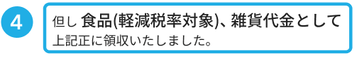 但し書きには何の対価としてお金が受け渡されたのかを「具体的」に記載します。語尾に「として」をつけて、軽減税率が適用されるものについては「軽減税率対象」の旨も記載します。