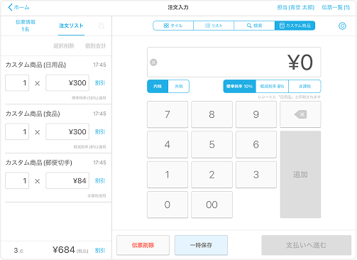 画面をタッチすることで簡単に会計処理を行えます。また、単価などの商品情報を事前に登録しておくことで、会計時に金額を入力する必要がなくなるため、入力ミスを防げます。会計の時間が短くなり、混雑が緩和されるというメリットもあります。