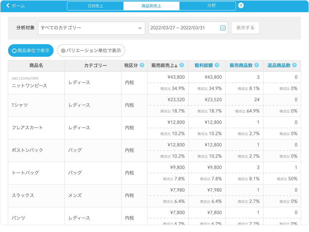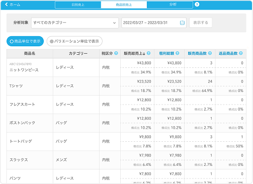 商品を販売すると、POSシステムに商品ごとの売上データが自動的に登録されます。集計された「どの商品が、いつ、どれくらいの個数売れたのか」といった情報を適宜確認し、販売戦略などに活かすことができます。