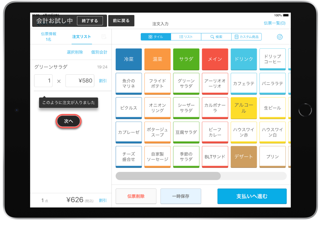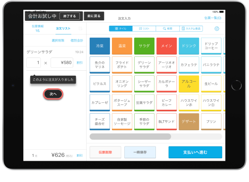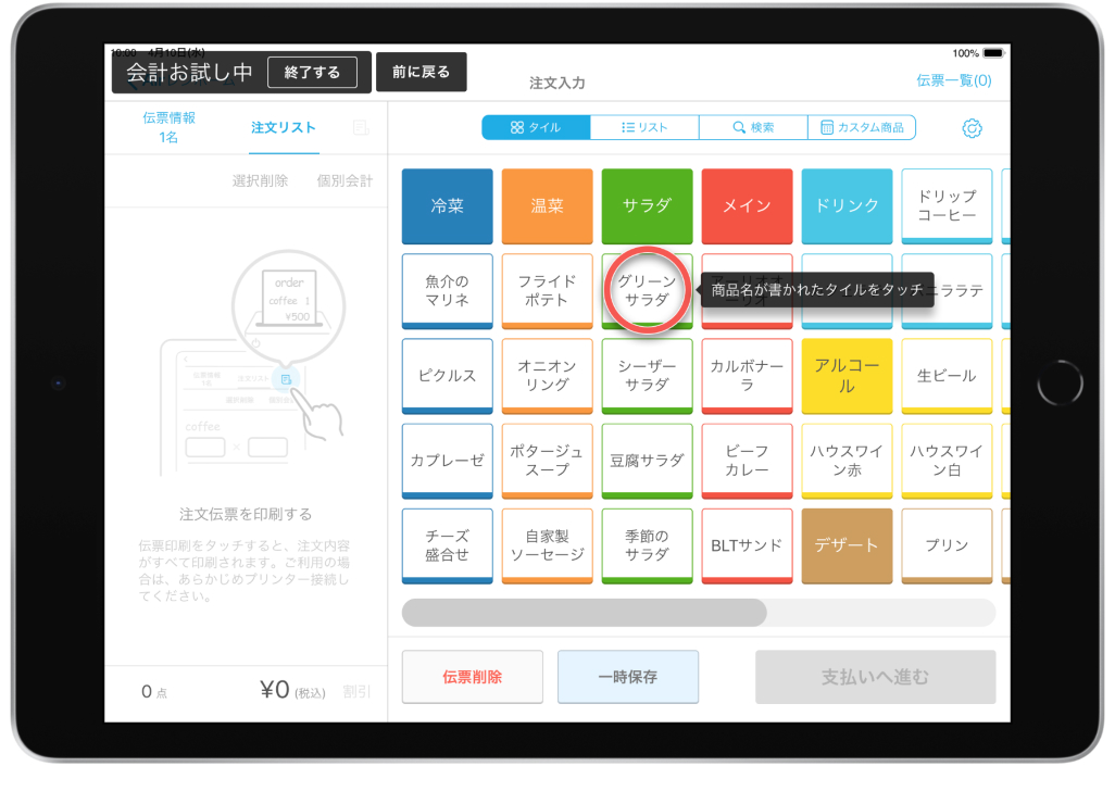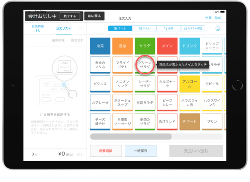 注文入力画面で商品名「グリーンサラダ」タッチすると、画面左に商品名「グリーンサラダ」が登録されるので、必要に応じて伝票情報を入力・修正する。