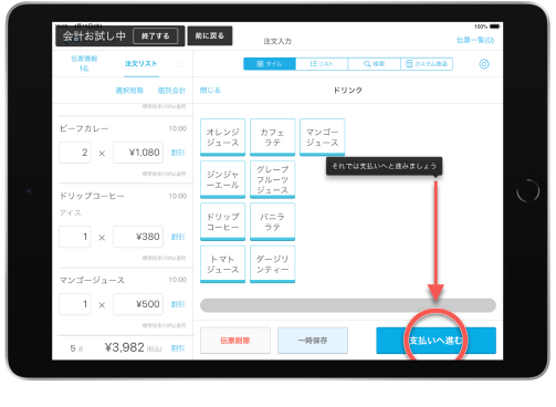 注文内容をすべてタッチ(入力)した後に「支払いへ進む」ボタンをタッチして、会計(お支払い)画面へと進みます。