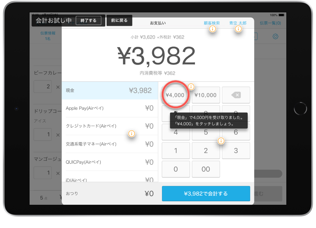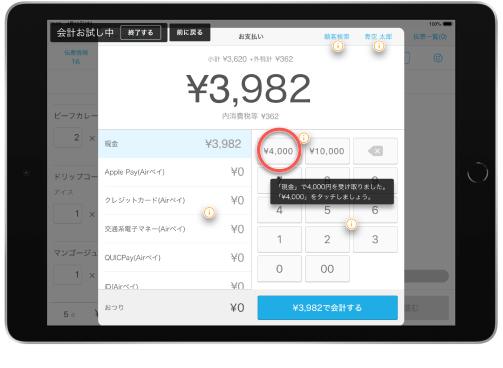 画面左側の支払い方法(画面では現金)を選択後、受取金額(画面では4,000円)を入力する。