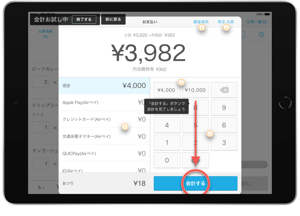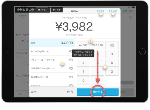画面右下の「会計する」ボタンをタッチして、会計を完了する。