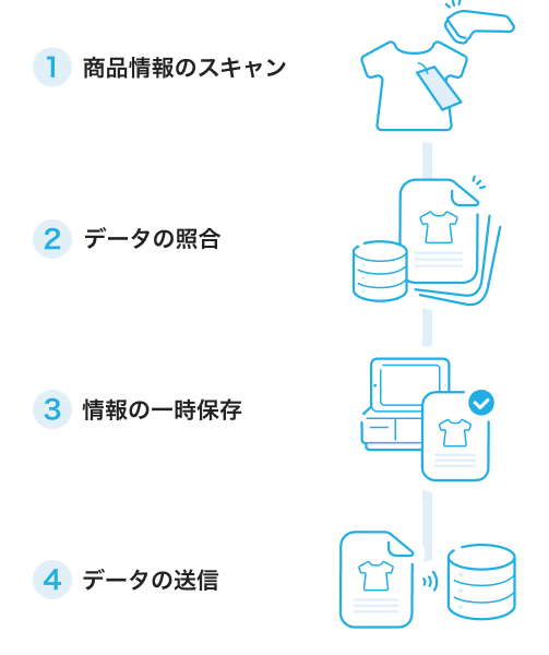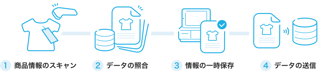 読み取ったバーコードの情報と、POSシステム内のデータベースに登録された商品名・価格などの商品情報が照合される。 -
