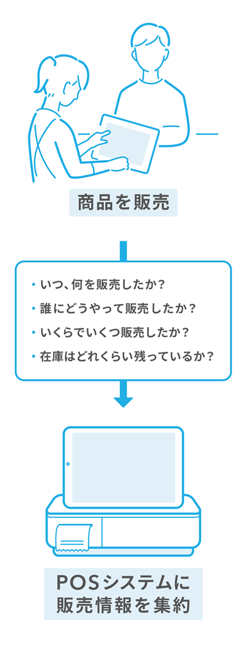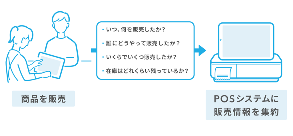 POSレジのPOS(ポス)は「Point of Sale」の略で、日本語では「販売時点情報管理」を意味します。わかりやすく言うと、商品やサービスを売ると同時に「いつ」「何を」「誰に」「どうやって」「いくらで」「いくつ」売ったのかをシステムで一元管理する仕組みです。