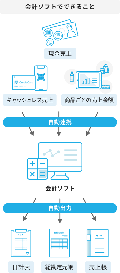 連携された売上データは、事前に設定しておいたルールに従い、会計ソフト内で自動的に「借方」「貸方」の仕訳処理が行われます。例えば、「飲食売上は売上高へ」「現金は現金勘定へ」「クレジット売上は未収金へ」といった仕訳が登録され、手作業での入力は不要です。その結果、総勘定元帳や日計表、売上帳といった帳簿が自動で作成され、記帳作業の負担が大きく軽減されます。経理初心者でも安心して管理ができます。