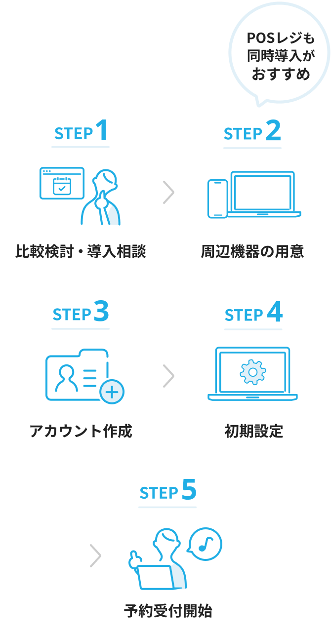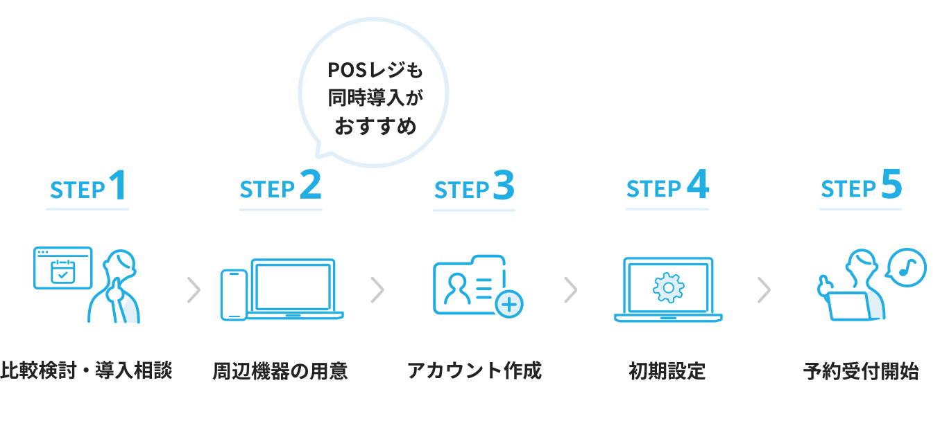 予約システムの導入手順はサービスによって異なりますが、ここでは『Airリザーブ』のようなWebサービス型のシステムを例に、一般的な5つのステップを紹介します。