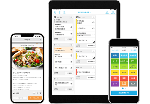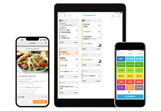 Airレジ オーダーと連携すると、注文・調理・配膳業務をよりカンタンに行えます。フロアと調理場をつないで、飲食店の業務を円滑にサポートします。詳しくはこちら