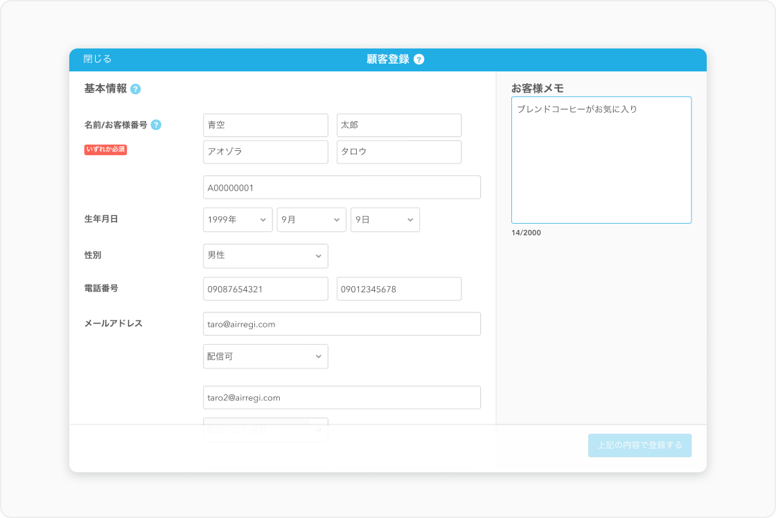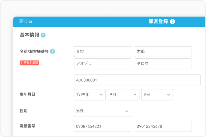 お客様の名前や電話番号などの基本情報を、顧客情報として登録して管理できます。