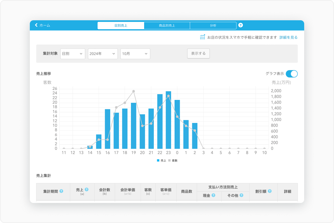 時間別や日別といった集計期間ごとの時間軸での売上だけでなく、商品軸での売上も確認できるため、売れ筋商品の分析にも活用できます。