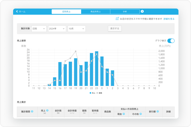 目的に合わせて集計項目や期間を設定した売上データを確認できます。