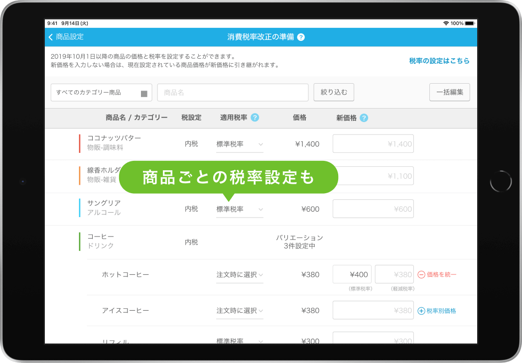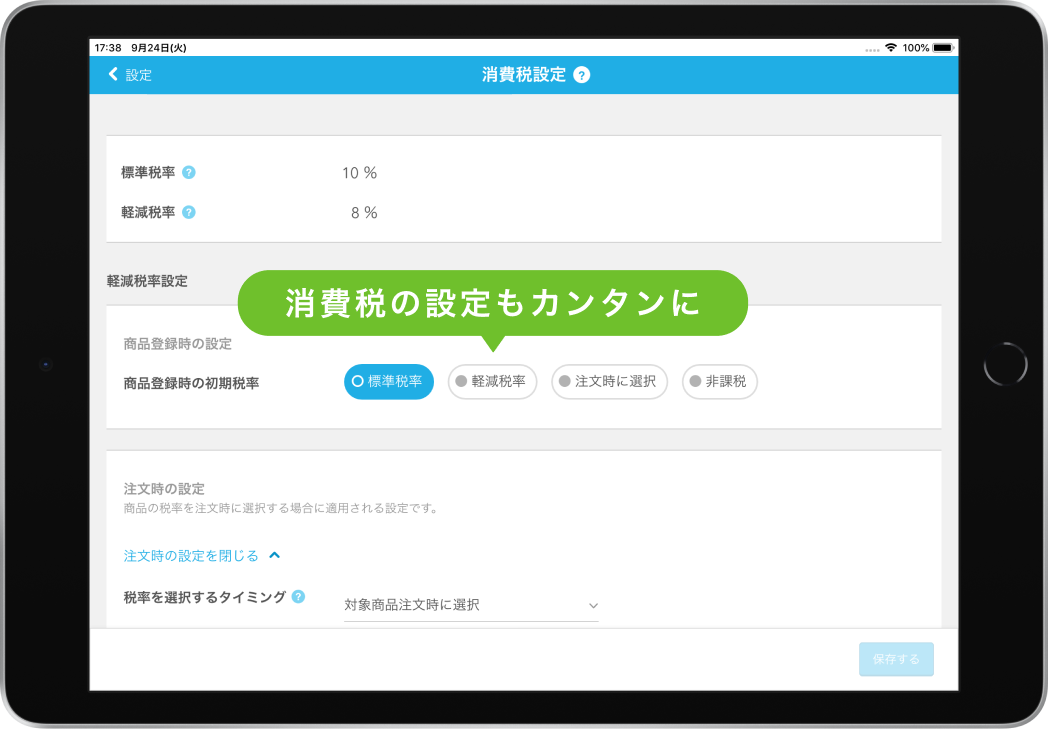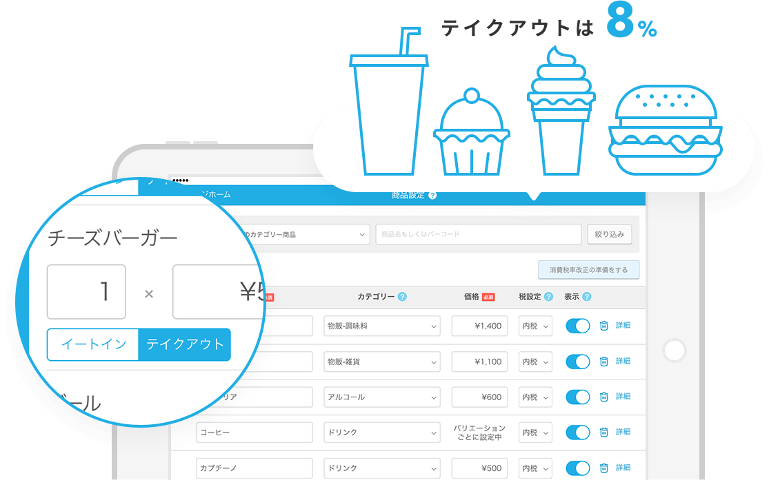 商品ごとの税率設定やイートイン/テイクアウトのお店に合わせた税率設定ができます。また税率ごとの合計金額のレシートへの印字も対応。事前の設定をするだけで複数税率への対応もカンタンにできます。