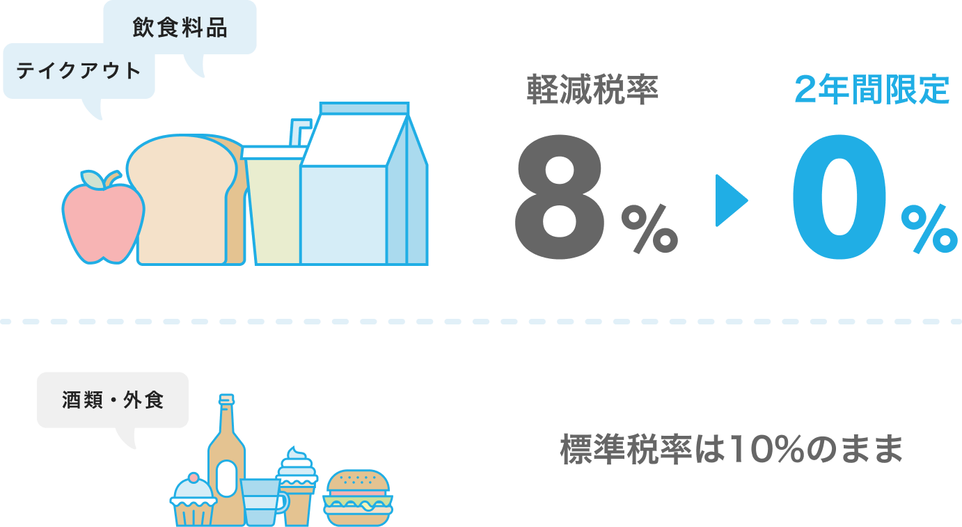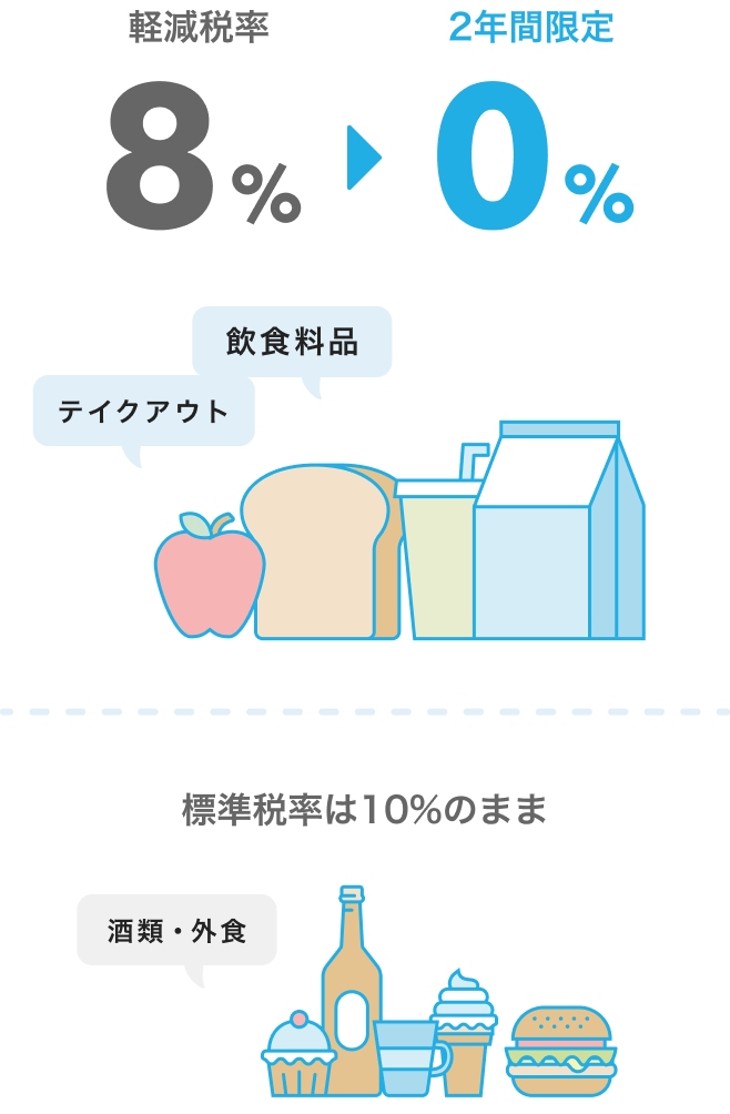 飲食料品の税率を2年間限定で0%に引き下げる案が検討されています。