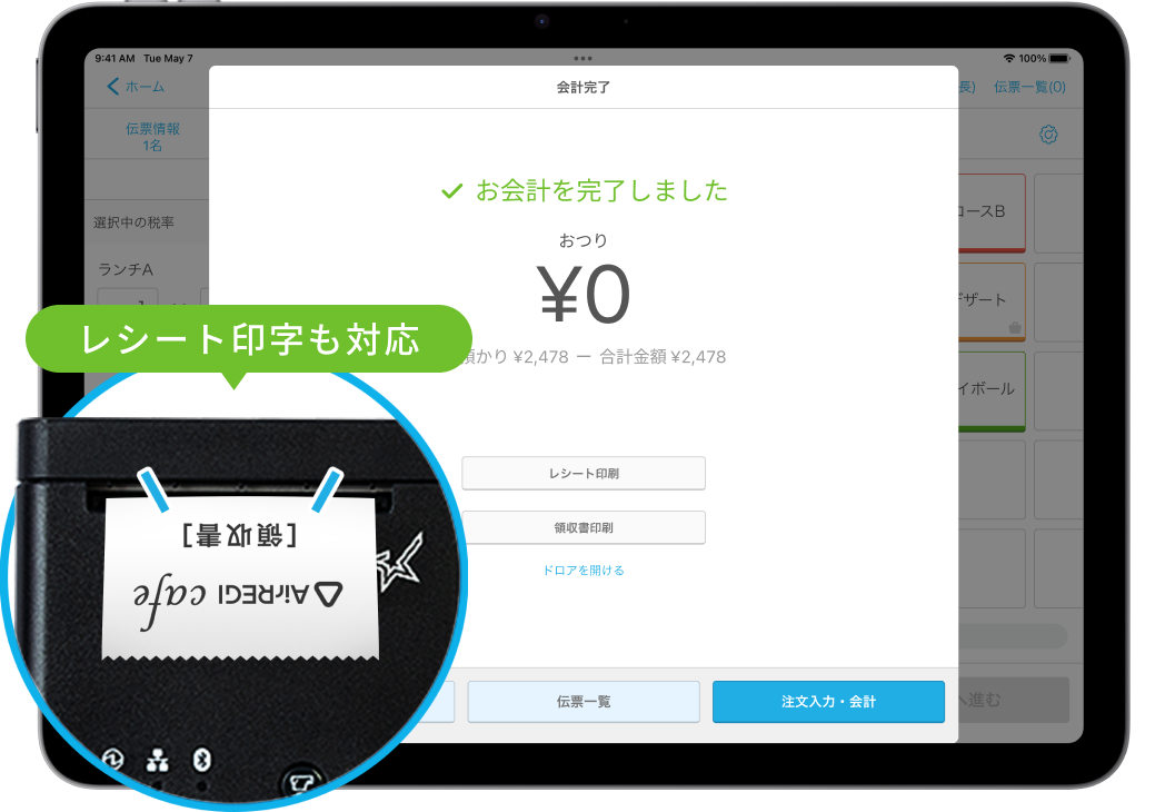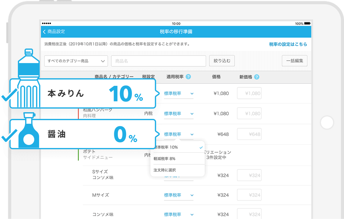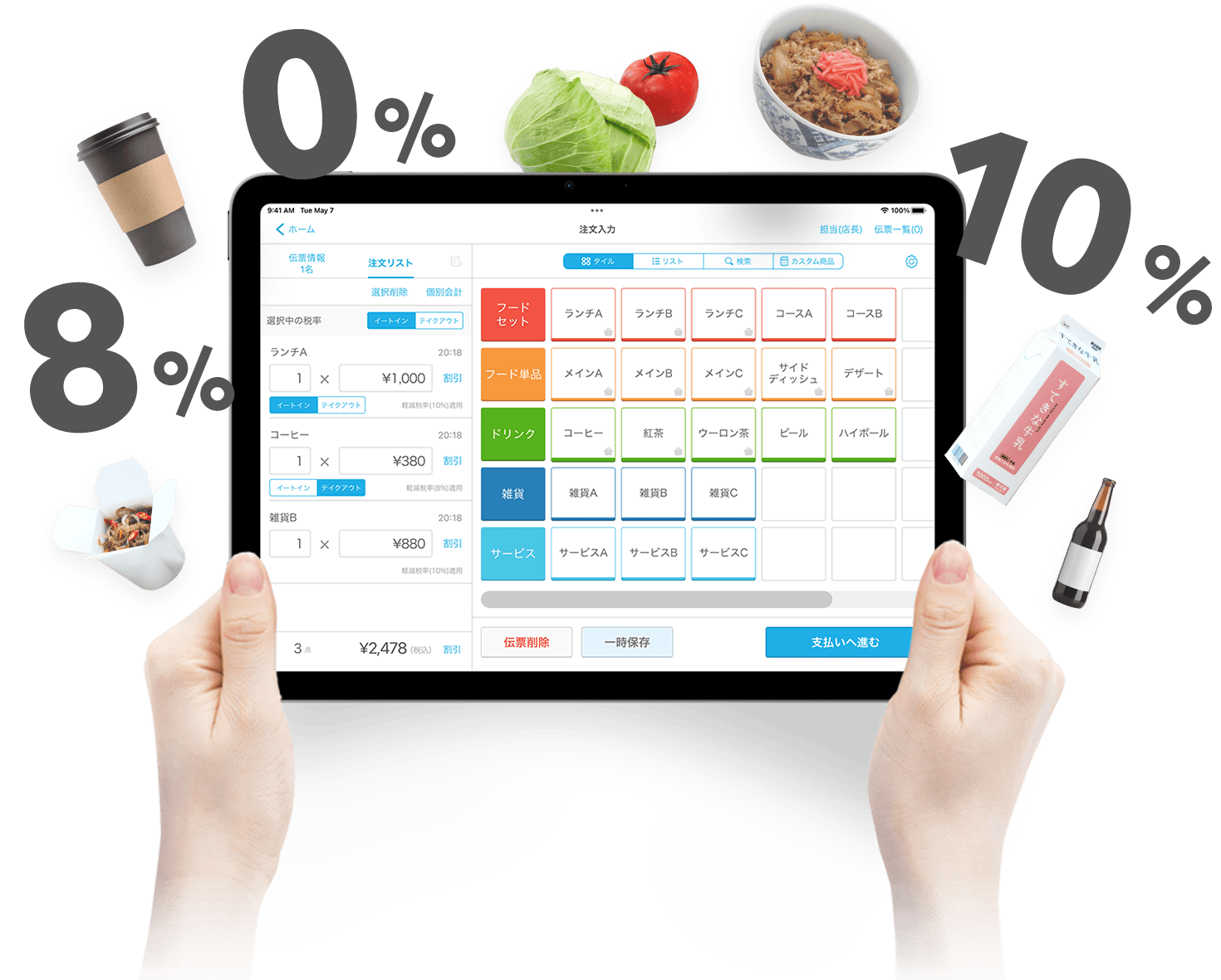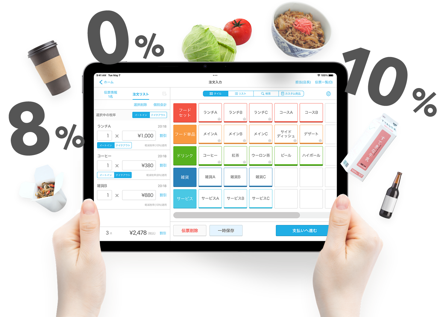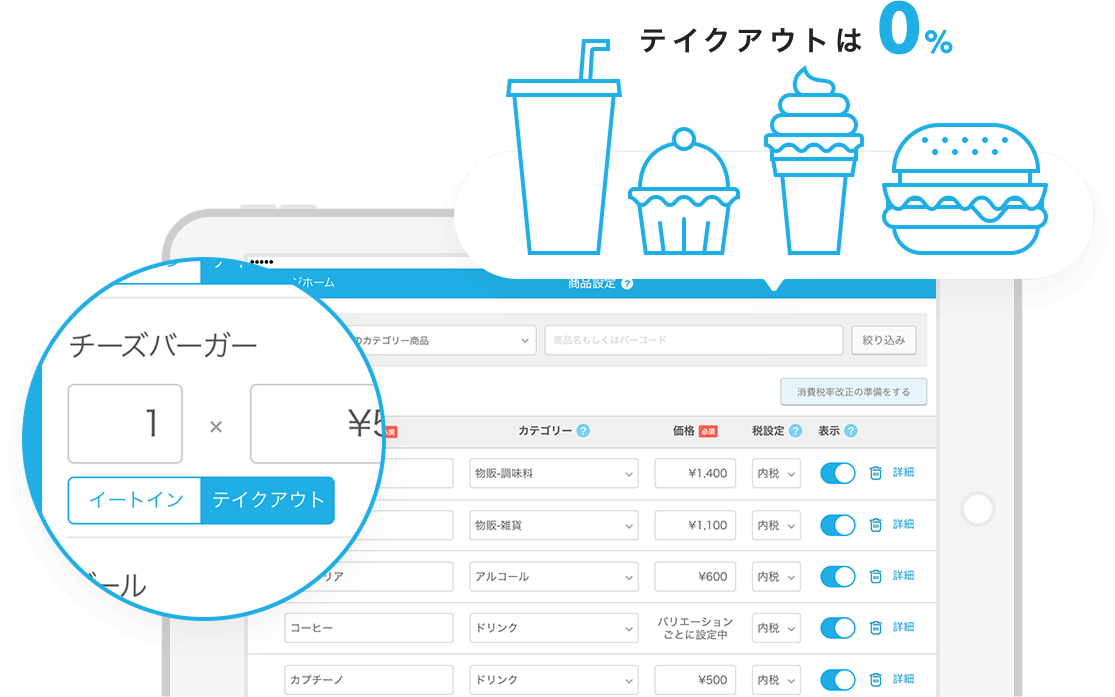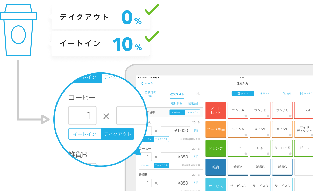 商品ごとの税率設定やイートイン/テイクアウトのお店に合わせた税率設定ができます。また税率ごとの合計金額のレシートへの印字も対応。事前の設定をするだけで複数税率への対応もカンタンにできます。