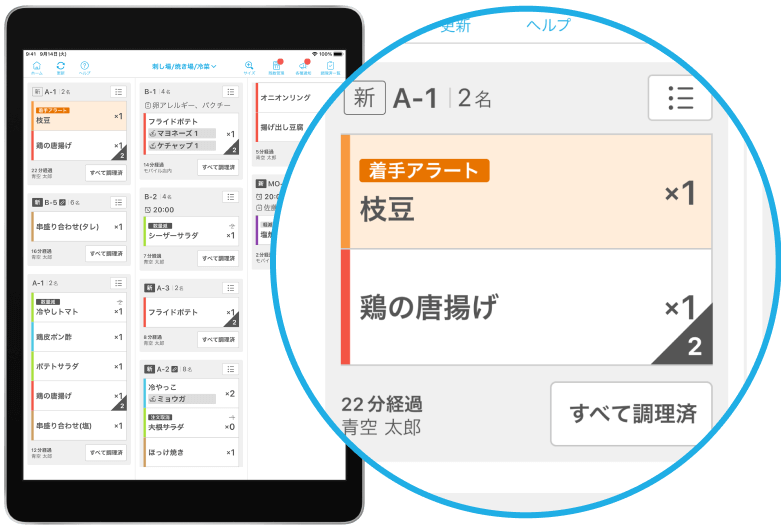 注文が最適な調理順に並び変え表示されて、提供スピードが向上します。また、提供が遅れそうな注文をお知らせするので、提供遅れ防止にも役立ちます。
