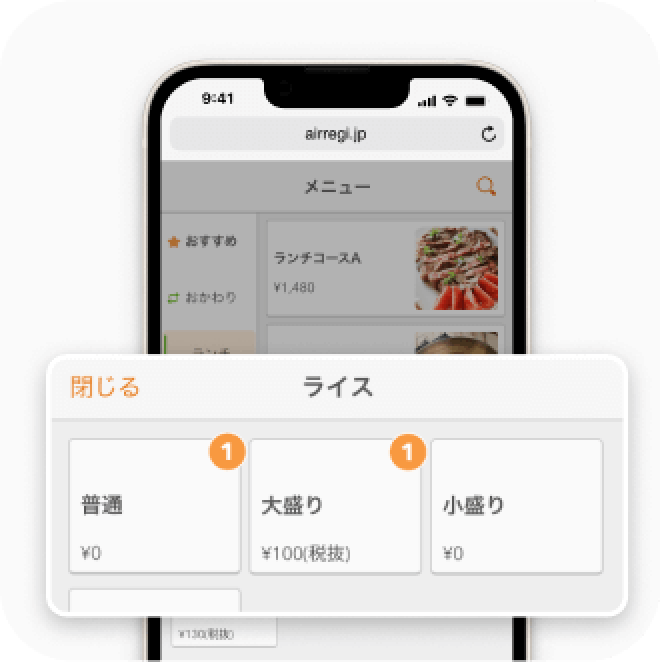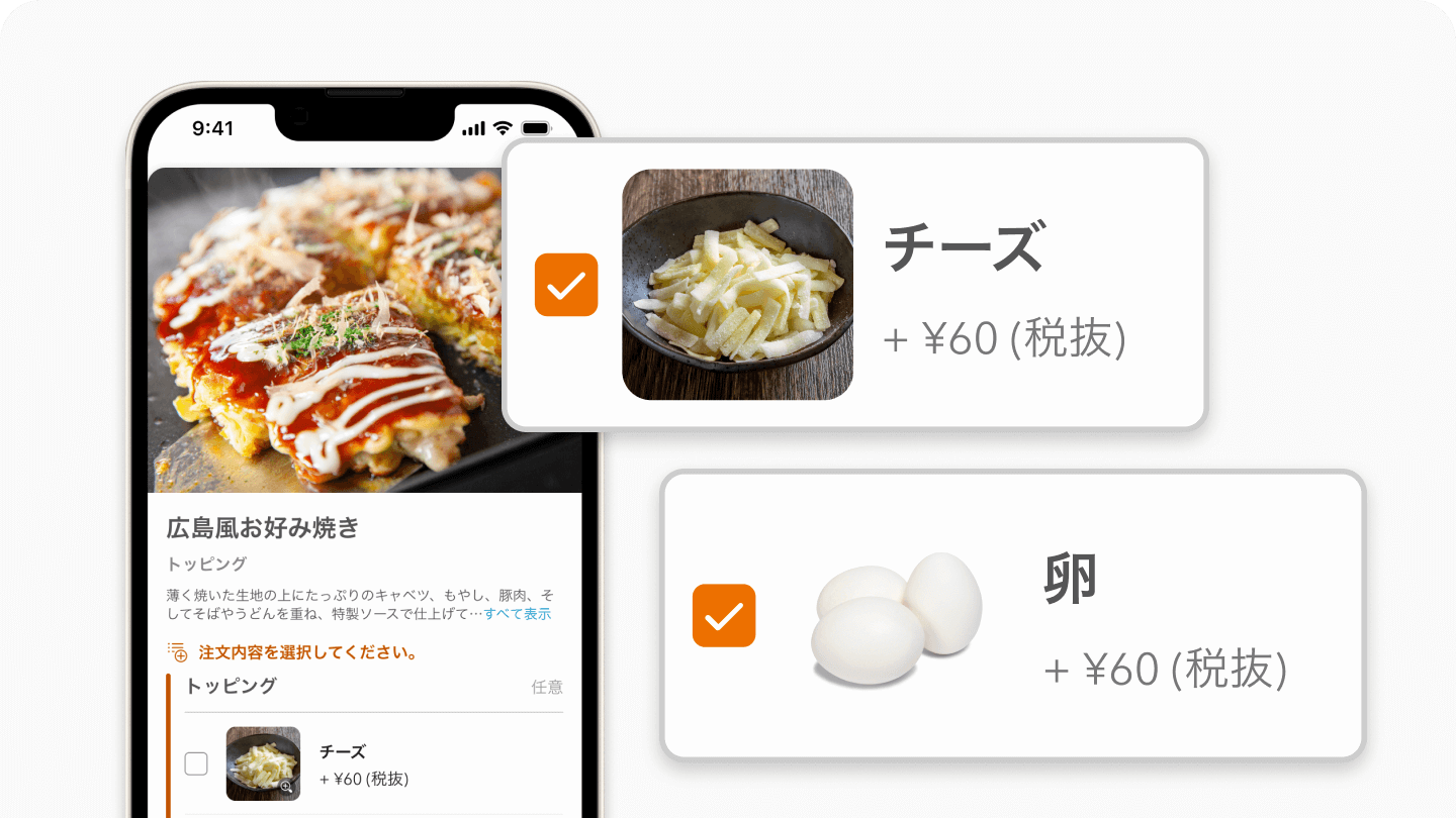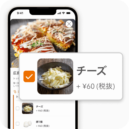 メニューごとにトッピングを登録でき、注文画面で一緒に注文できるので、+αの注文を後押しできます。