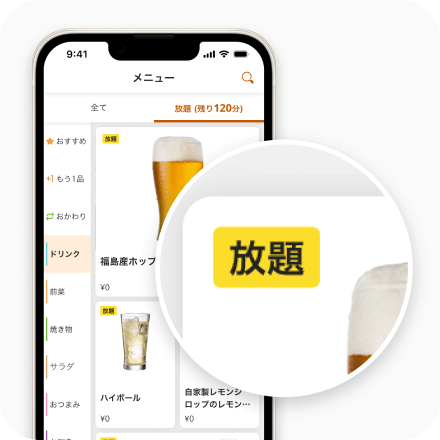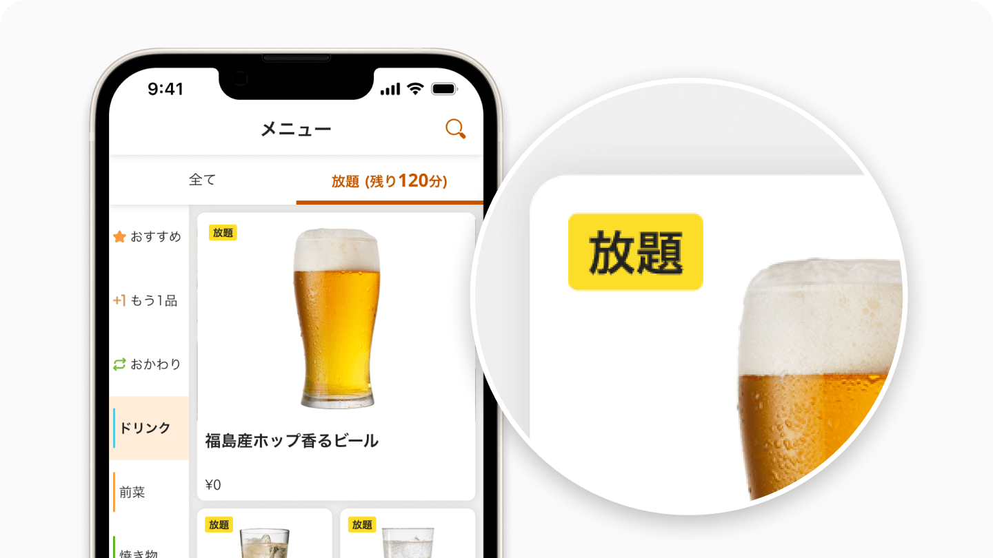 放題商品を一覧で表示できます。対象商品が「放題」タグで強調され、通常価格の商品との違いがひとめでわかるので、注⽂間違いを防げます。
